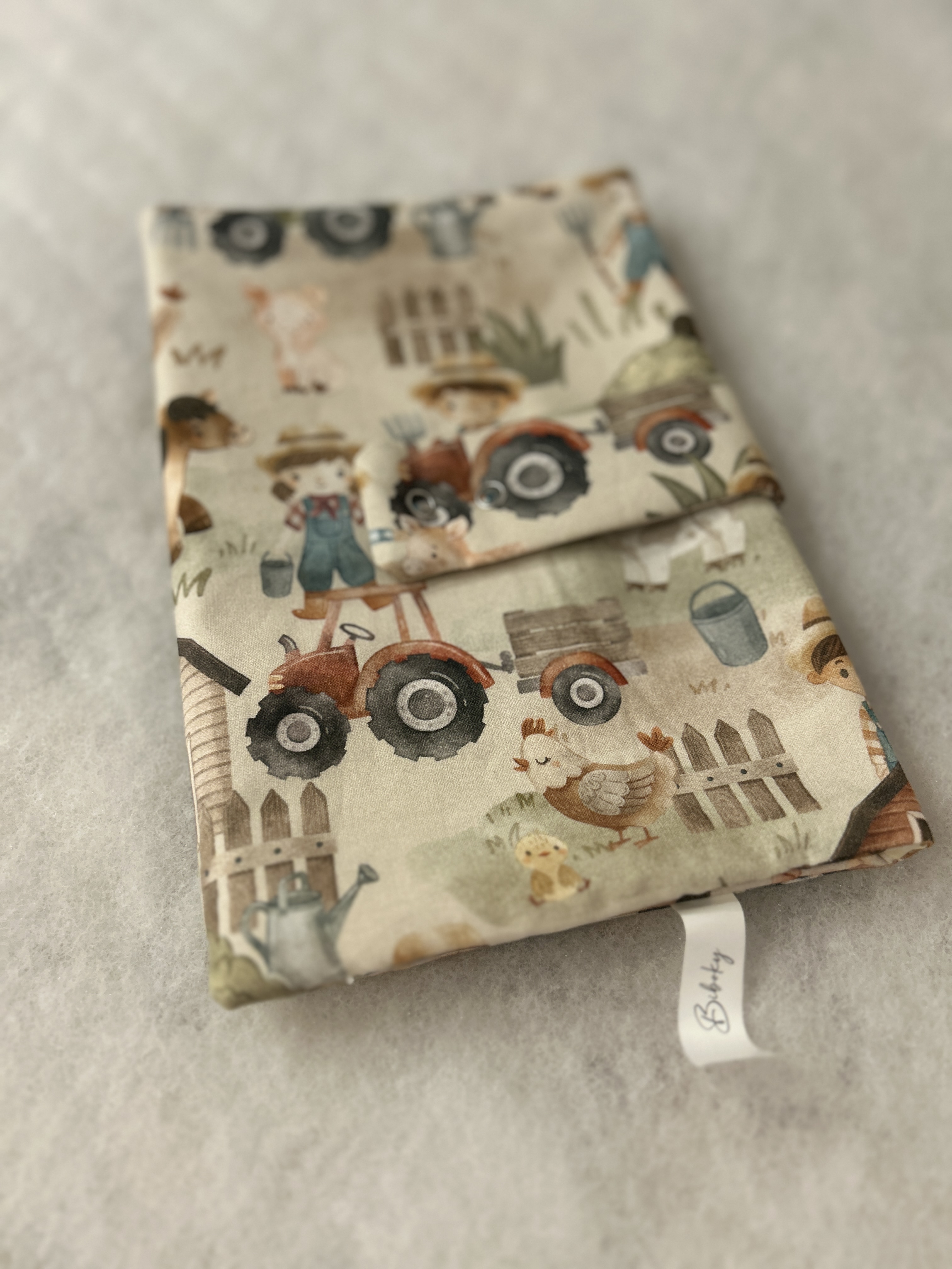 Pamutvászonból készült, egy cipzáras és egy sima zsebbel. Popsi törlő tartóval.