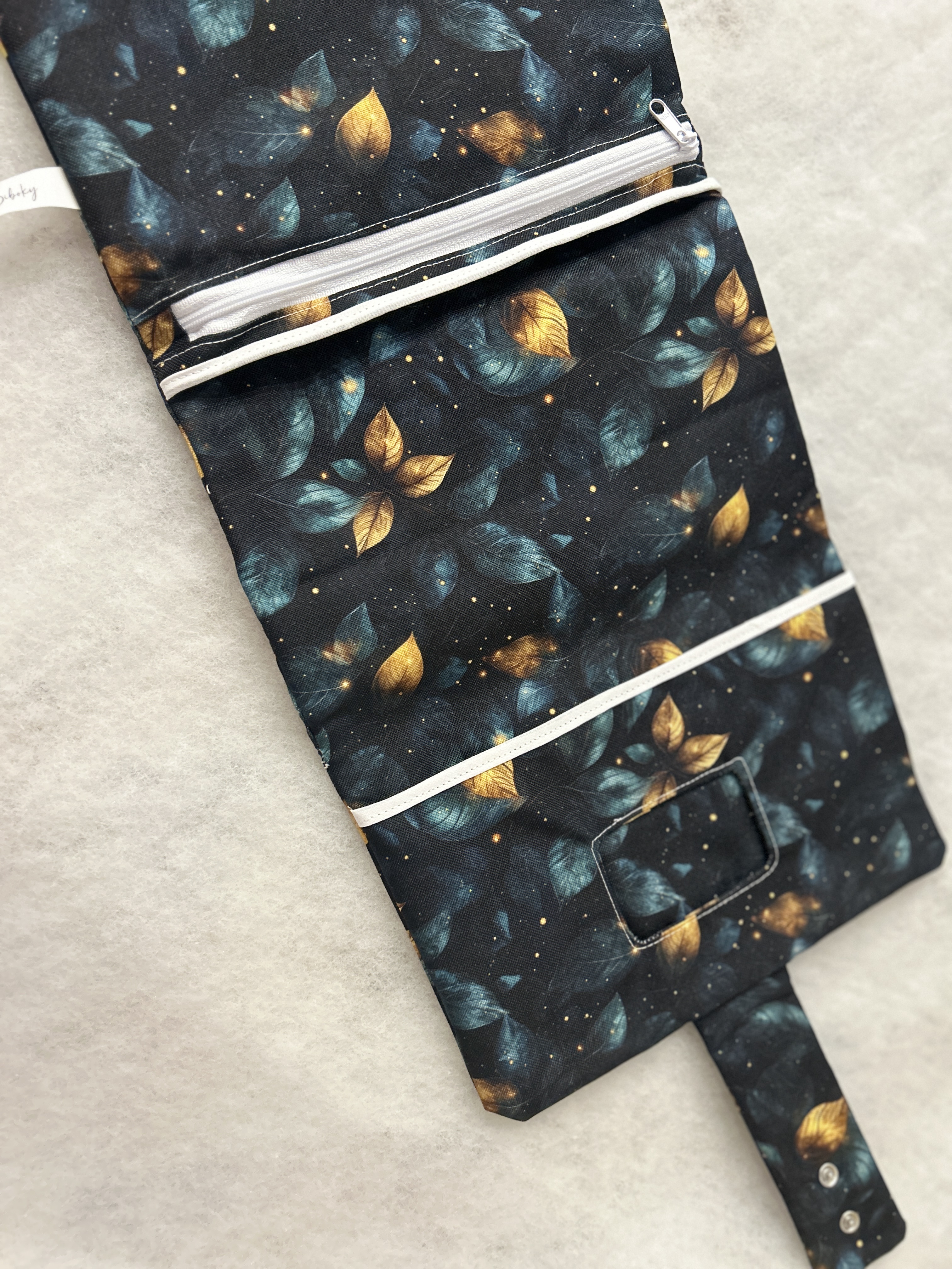 Vízlepergetős anyagból készült, egy cipzáras és egy sima zsebbel. Popsi törlő tartóval.